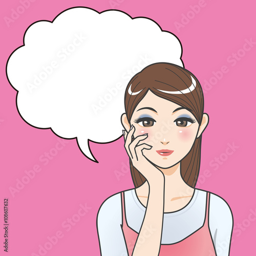Vector illustration of beautiful woman pointing finger, speech bubble. Young girl gesturing in retro pop art comic style.