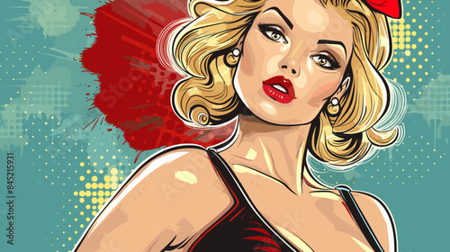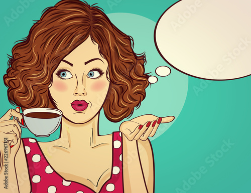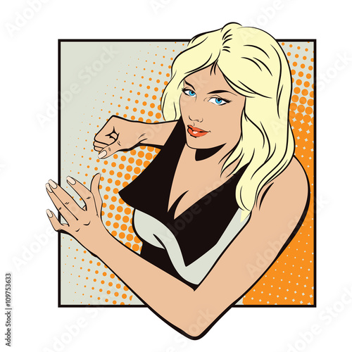 Vector illustration of young woman holding blank card. Beautiful girl portrait in retro pop art comic style.