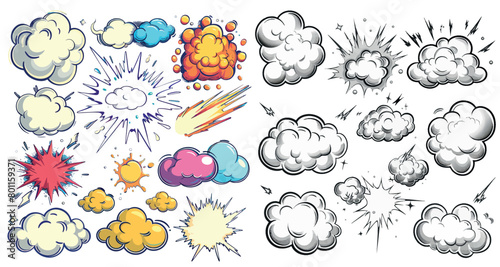 Vector vintage pop art explosion boom set. Explosive pyrotechnic effects in comic book style.