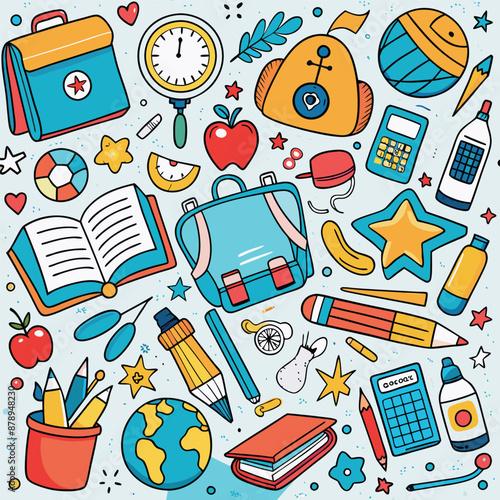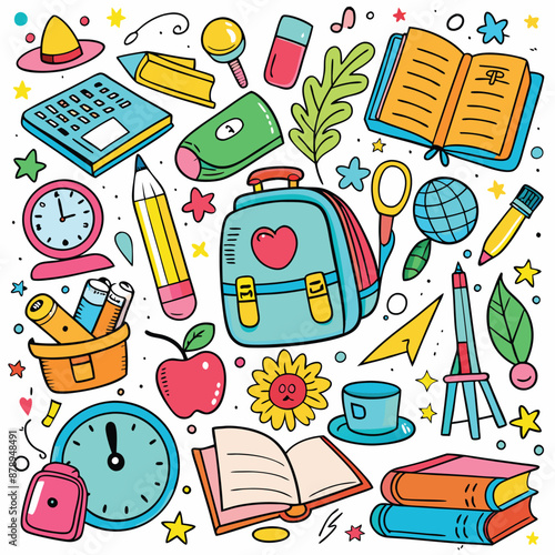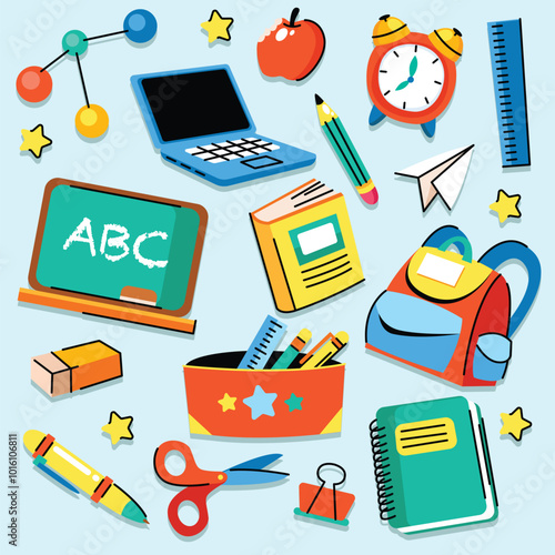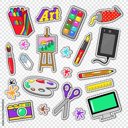 Vector pop art comic style fashion school patches, stickers set with pen, pencil, backpack, scissors, eyeglasses, calculator, paints, glue, loupe ruler exercise book and shoes.