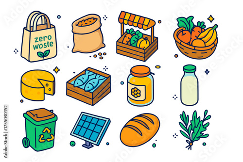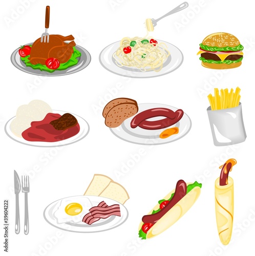 Vector pop art trendy patches set with food. Fried chicken, salad, bread, cake, ketchup, sauce etc. in retro comic style.
