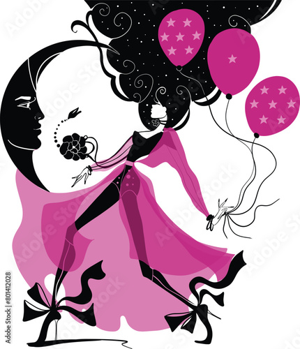Vector illustration of young woman with flower bouquet standing back. Flower shop poster in retro pop art comic style.