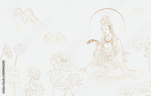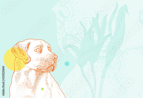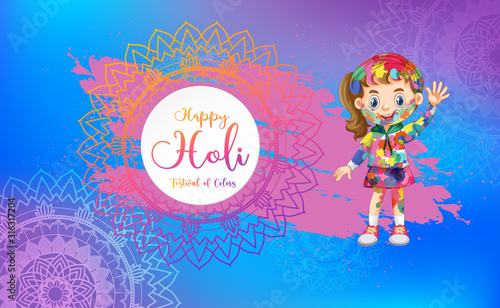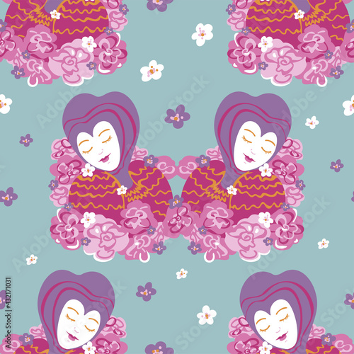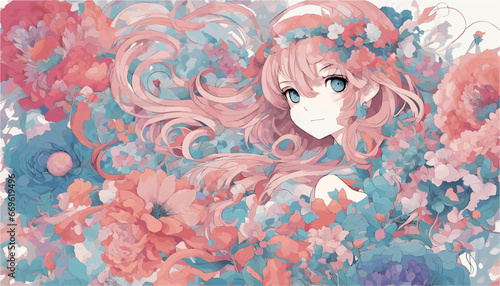 Vector illustration of young girl standing back and peony, forget-me-nots flowers around her in retro pop art comic style.