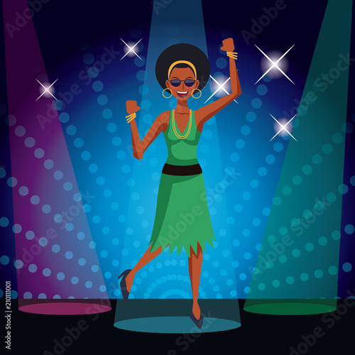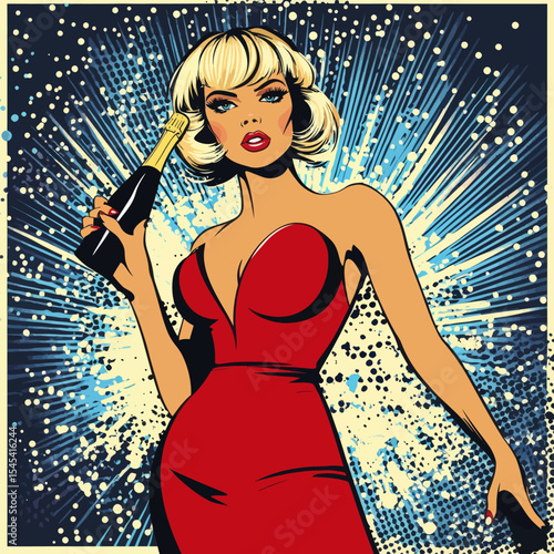 Vector illustration of beautiful girl singer being on the stage in retro pop art comic style.