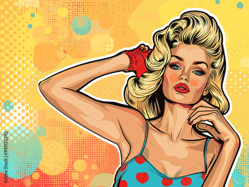 Vector illustration of beautiful blonde woman with tasty ice cream cone. Pin-up girl portrait in retro pop art comic style.