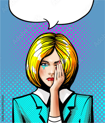 Vector illustration of beautiful young woman dreaming, thought bubble. Retro pop art comic style.