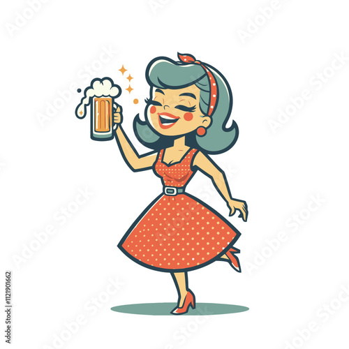 Vector illustration of pretty girl waitress with beer and fish. Oktoberfest beer festival concept in retro pop art comic style.