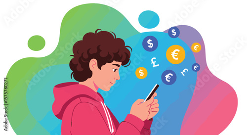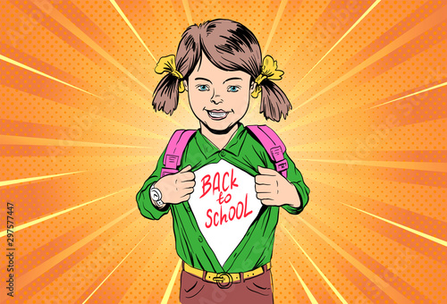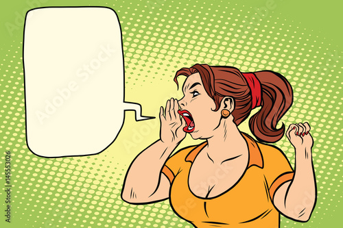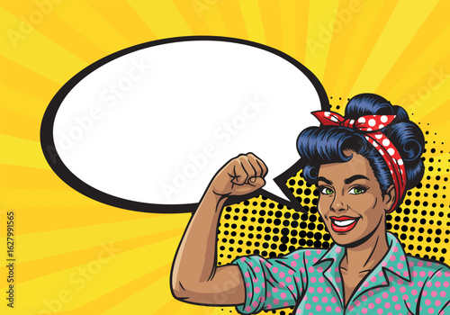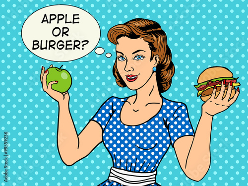 Vector illustration of happy beautiful woman holding red heart in her hand. Romantic lady in love, retro pop art comic style.