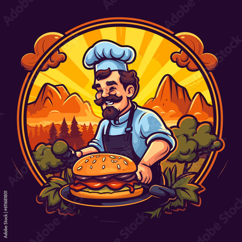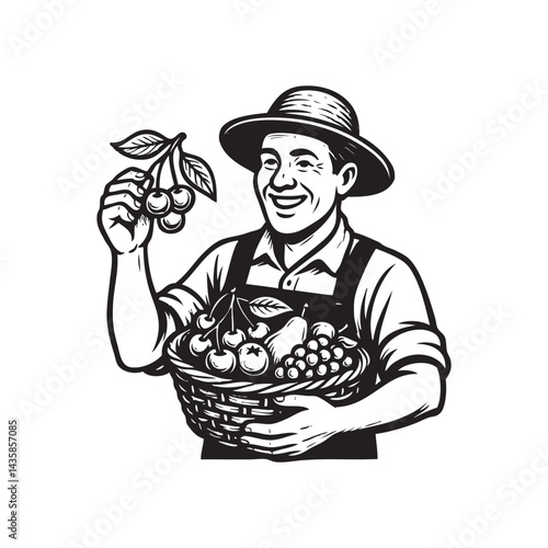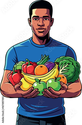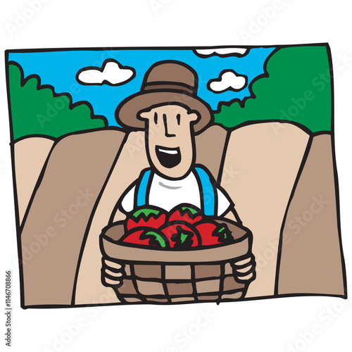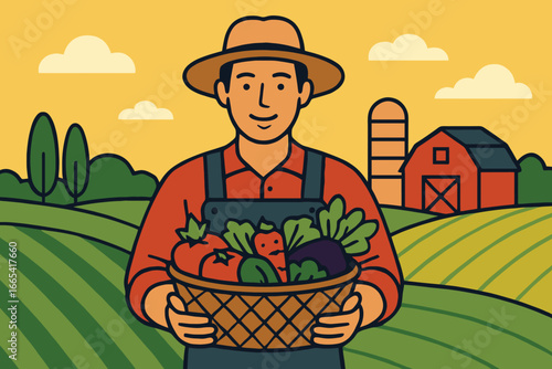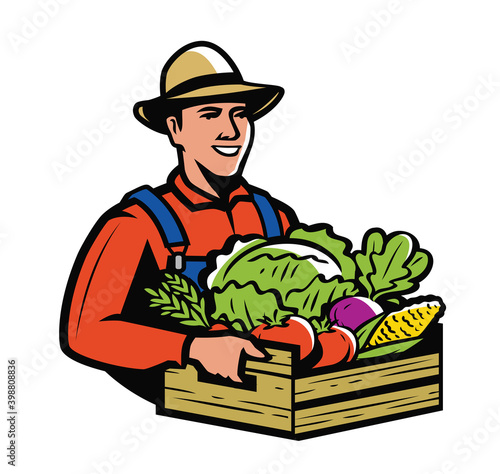 Vector illustration of smiling farmer holding tray with fresh vegetables. Gardener male in retro pop art comic style.