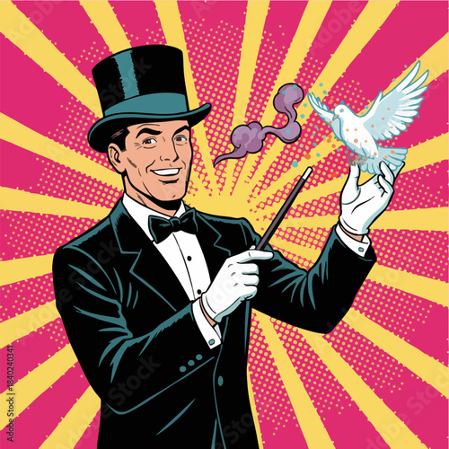 Vector illustration of magician performing trick. Illusions magic show or circus show design element in retro pop art comic style.
