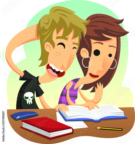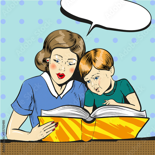 Vector illustration of woman reading book to her son, speech bubble. Mother and son in retro pop art comic style.