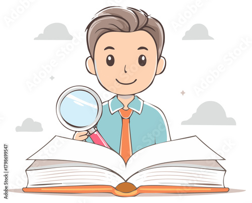 Vector illustration of schoolboy sitting at desk with opened book on it. Clever pupil with raised hand ready to answer the question. Back to school poster in retro pop art comic style.