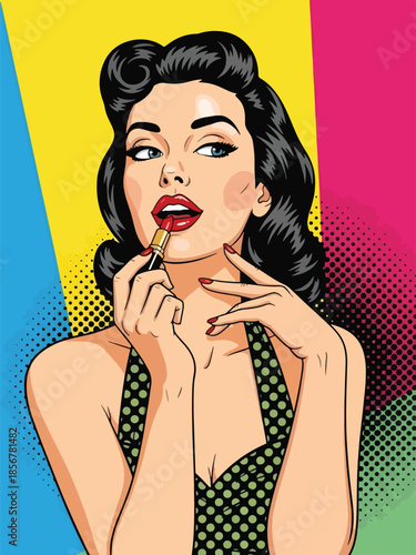 Vector illustration of pretty blond girl painting her lips with red lipstick, thought bubble. Beautiful woman applying make-up in retro pop art comic style.
