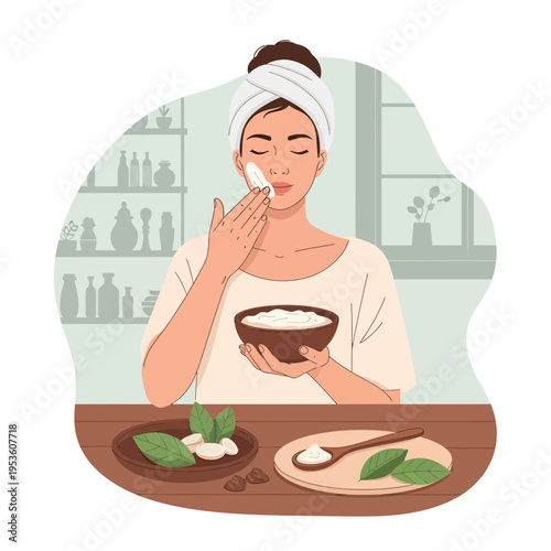Vector illustration of young woman enjoying aromatherapy procedures. Spa salon service concept in retro pop art comic style.