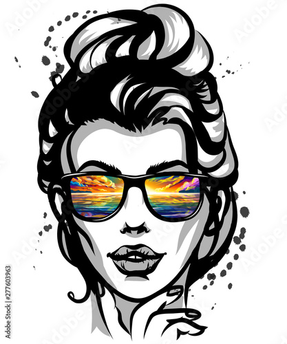 Vector illustration of smiling and winking young woman in scuba diving equipment. Diver female in retro pop art comic style.