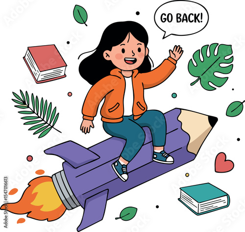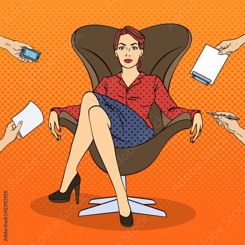 Vector illustration of young woman sitting on pile of books. Beautiful lady teacher, businesswoman reading book in retro pop art comic style.