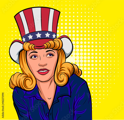 Vector illustration of young woman reading book. Vintage pretty girl in blue summer hat and dress in retro pop art comic style.