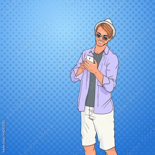 Vector pop art man in sunglasses holding credit card. Comic book vintage illustration.