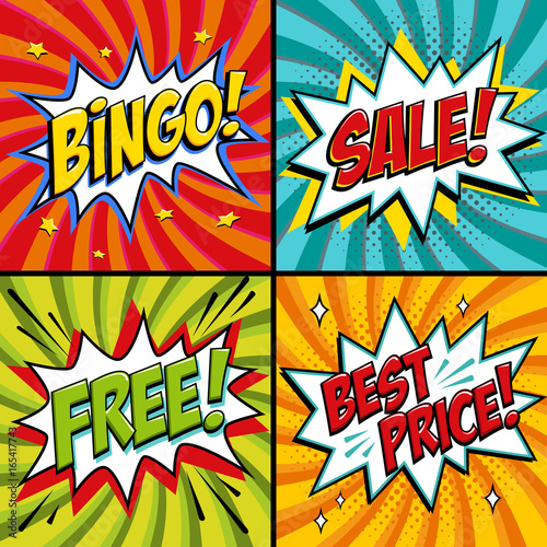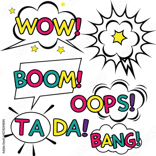 Vector set of vintage pop art patches, stickers and speech bubbles with fashion phrases and expressions Yep, Oh, Bam, Wow, Pop, Cool, New. Comic book sound effects.