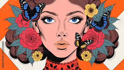 Vector illustration of beautiful young woman and peony flowers around her. Sexy pin-up girl in retro pop art comic style.