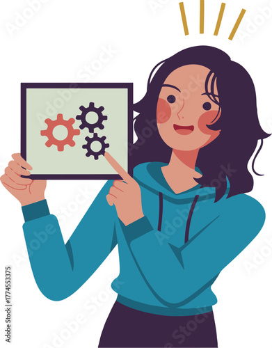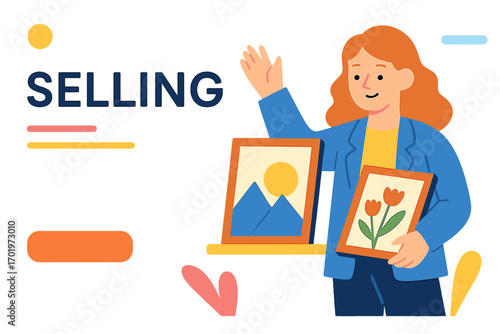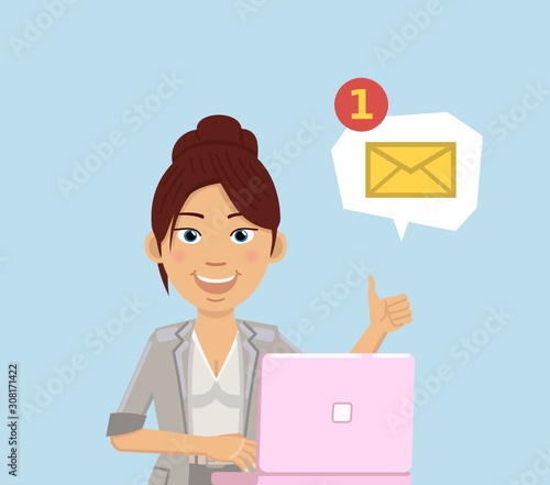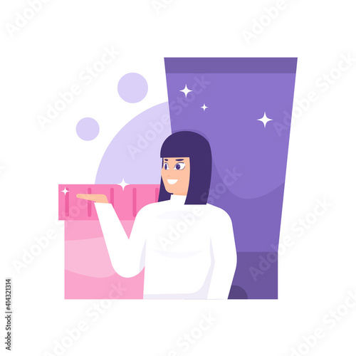 Vector illustration of beautiful woman showing or advertising something, speech bubble. Retro pop art comic style.