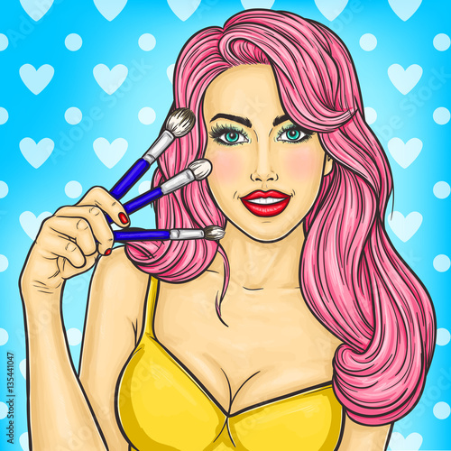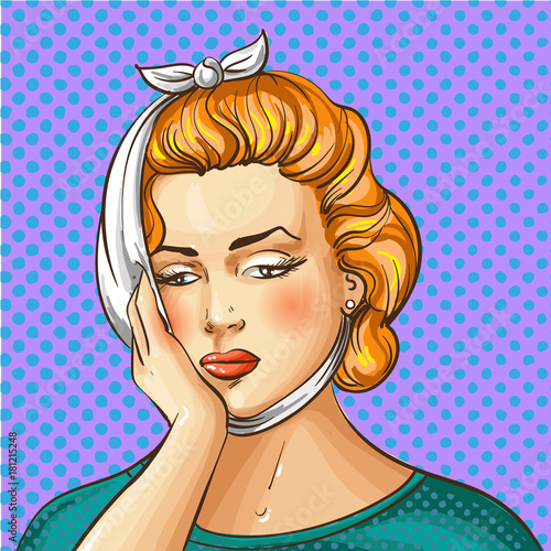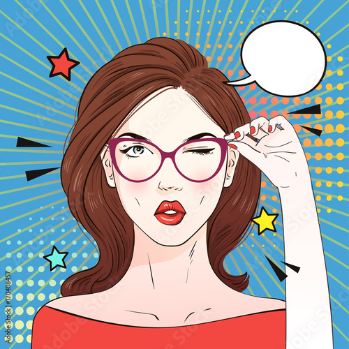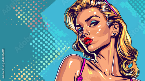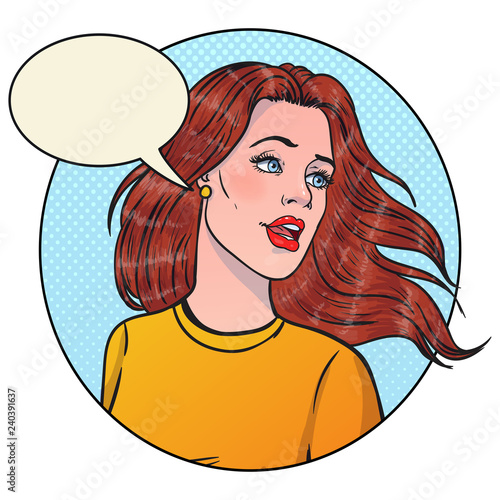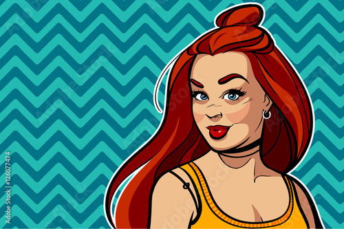 Vector illustration of smiling young girl showing victory or peace hand sign or gesture. Beautiful pin-up girl gesturing in retro pop art comic style.