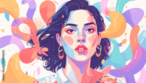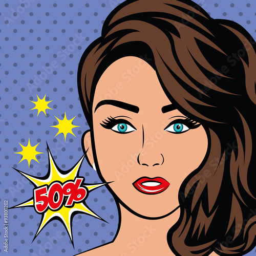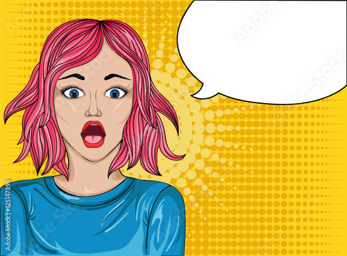 Vector illustration of beautiful woman pointing finger, boom speech bubble. Wonder girl gesturing in retro pop art comic style.