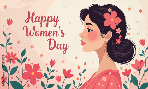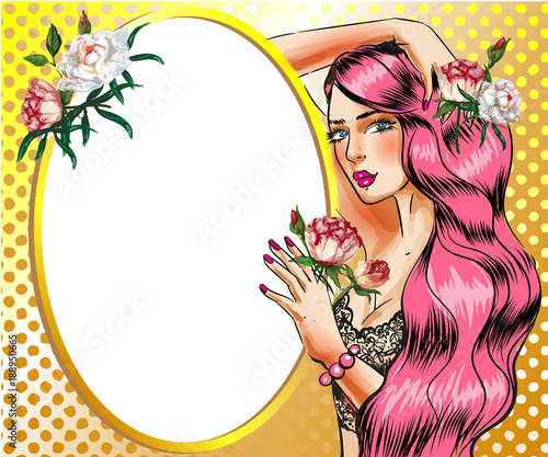 Vector illustration of sexy pin up girl with long waving pink hair standing in front of mirror. Beautiful glamour woman with flowers portrait in retro pop art comic style.