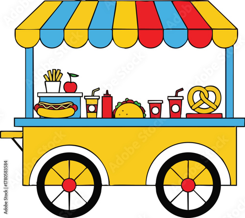 Vector popcorn local street market flat illustration. Takeaway fast food shop isolated on white background. Small business concept