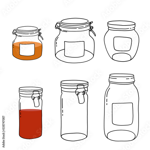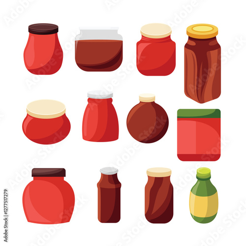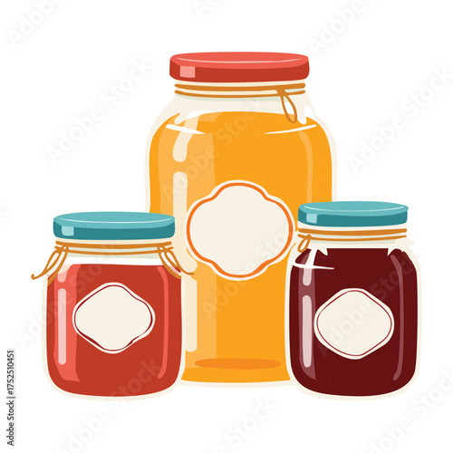 Vector fruit jam jar icon set. Delicious strawberry, peach, raspberry preserves, etc. Realistic jam jars decoration design. Glass jar with metal cap and kraft paper wrapped lid, twine collection.