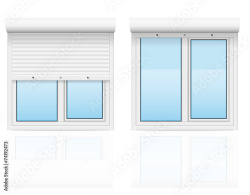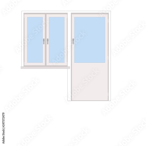 Vector realistic illustration of living room interior with white plastic closed window with white curtains and light blue sky with white clouds outside the window.