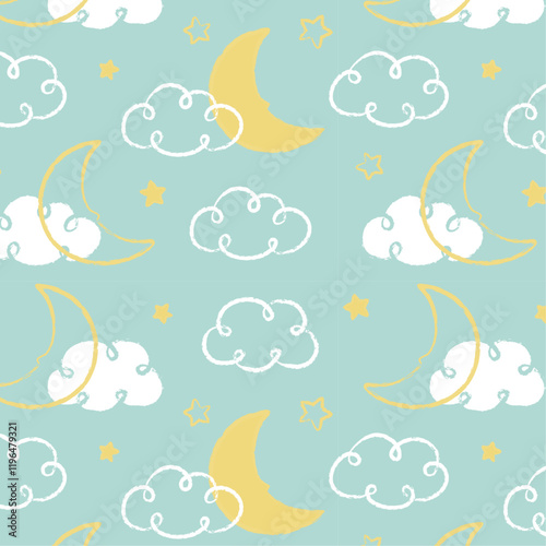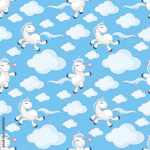 Vector seamless pattern with beautiful princess riding cute flying unicorn in the sky. Medieval cartoon characters background, wallpaper, fabric, wrapping paper.