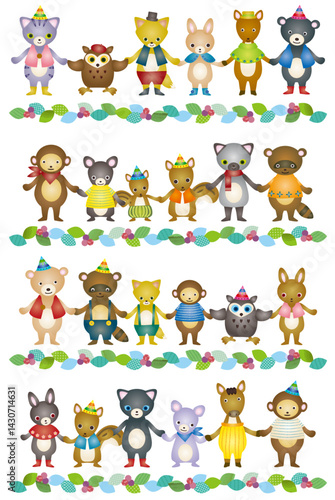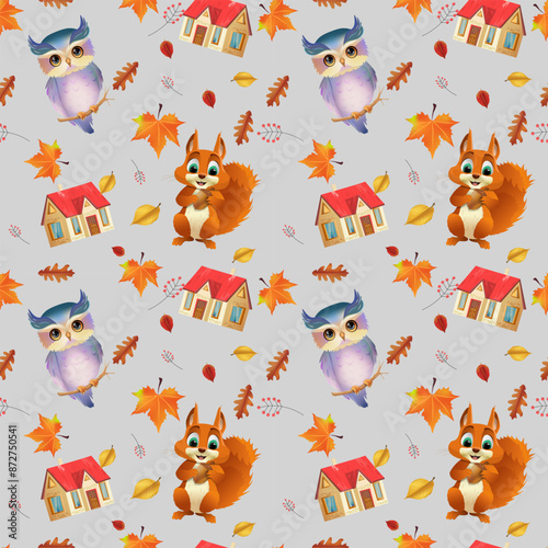 Vector seamless pattern with cute deer, raccoon and squirrel wearing antler headbands and christmas tree lights. Christmas animals background, wallpaper, fabric, wrapping paper.