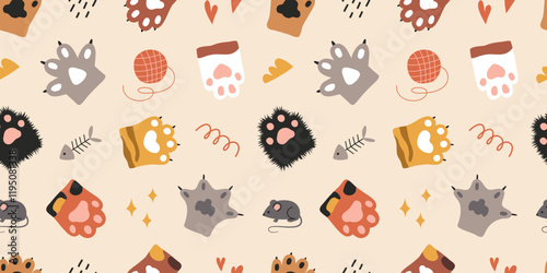 Vector seamless pattern with cute fox, bear, owl with xmas tree lights, holly berries wreath, gift boxes. Christmas animals background, wallpaper, fabric, wrapping paper.