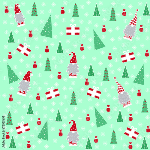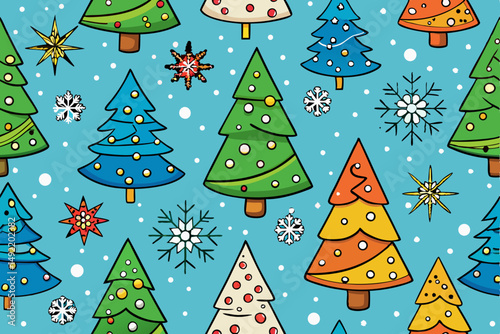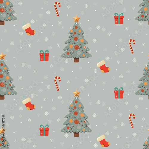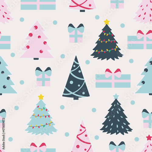 Vector seamless pattern with xmas trees, gift boxes and cute cat with reindeer antler headband on its head. Christmas cats background, wallpaper, fabric, wrapping paper.