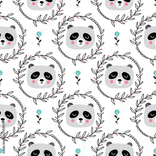 Vector seamless pattern with cute pandas eating bamboo leaves and donuts. Funny eating animals background, wallpaper, fabric, wrapping paper.