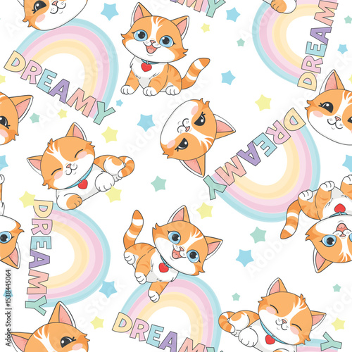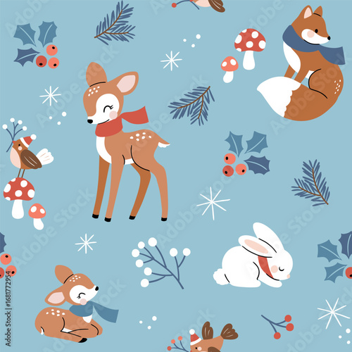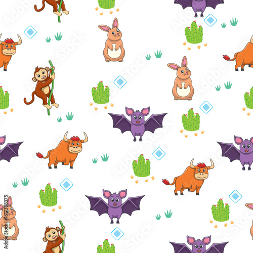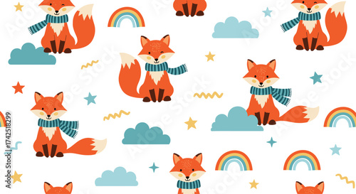 Vector seamless pattern with cute foxes flying in the sky. Funny animals background, wallpaper, fabric, wrapping paper.