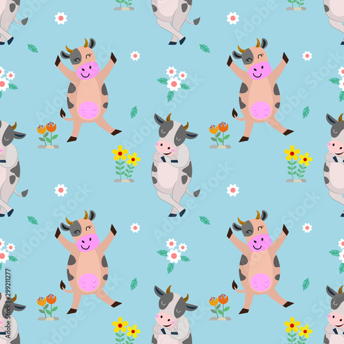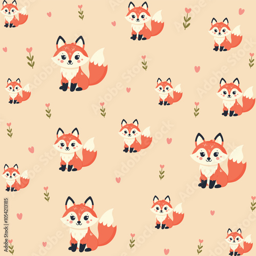 Vector seamless pattern with cute foxes with cake and cup of tea. Funny animals background, wallpaper, fabric, wrapping paper.