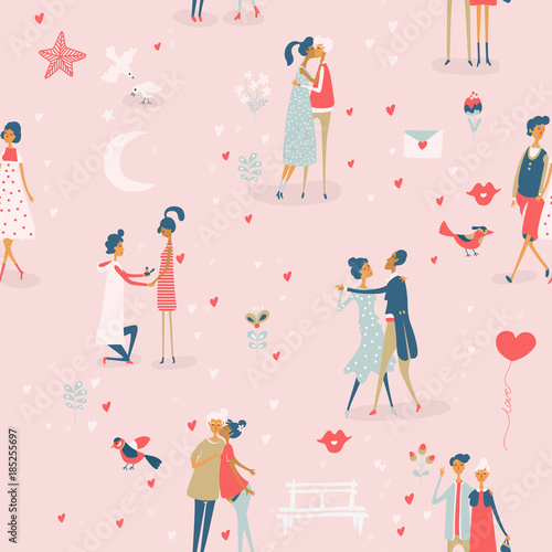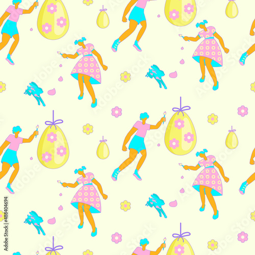 Vector seamless pattern with cute little girls, kind sorceresses, fairy tale characters doing magic using magic wand and potion. Childish enchantress background, wallpaper, fabric, wrapping paper.