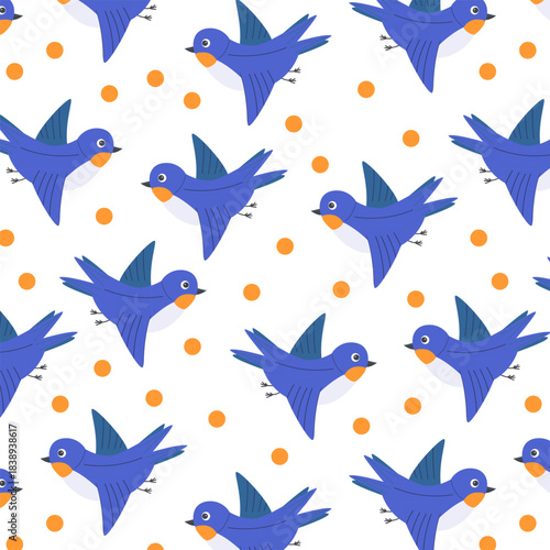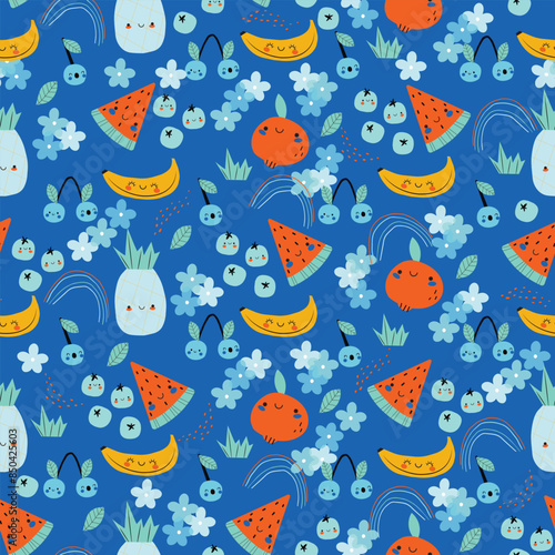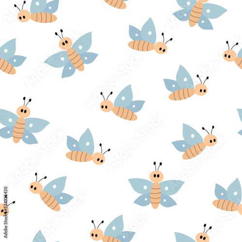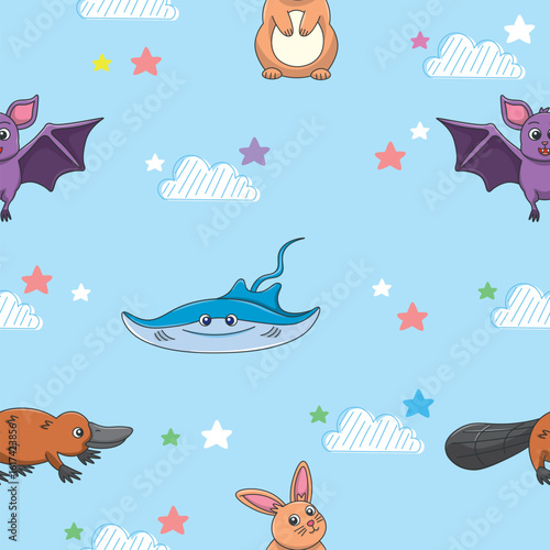 Vector seamless pattern with cute little girls, mythical creatures and fairy tale characters with magic wand flying in the sky. Childish enchantress background, wallpaper, fabric, wrapping paper.
