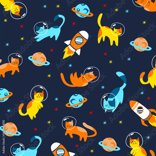 Vector seamless pattern with cute sleeping cats, night starry sky. Funny sleeping animals background, wallpaper, fabric, wrapping paper.