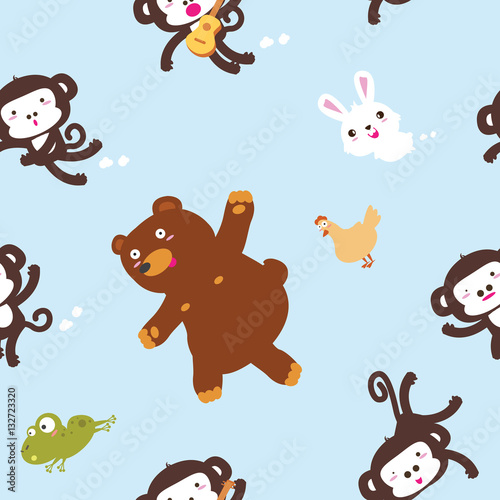 Vector seamless pattern with cute squirrel and hedgehog, spring flowers and birds. Funny spring animals background, wallpaper, fabric, wrapping paper.