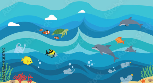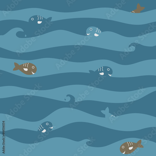 Vector seamless pattern with pirate accessories and marine animals. Dolphin, shark, crab, starfish and glass bottle with message. Childish pirate background, wallpaper, fabric, wrapping paper.
