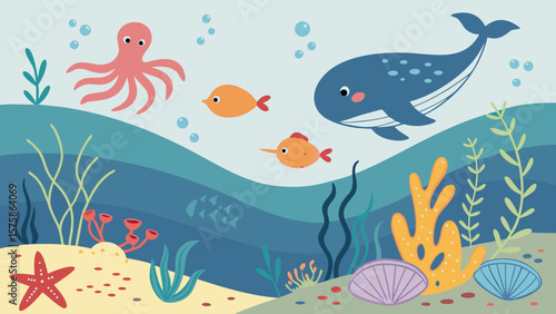 Vector seamless pattern with pirate accessories and marine animals. Jellyfish in eye patch, crab, fish, starfish, treasure chest and skull. Childish pirate background wallpaper fabric wrapping paper.
