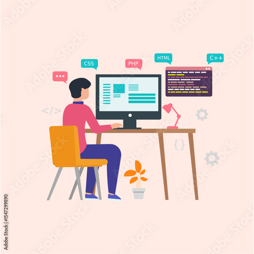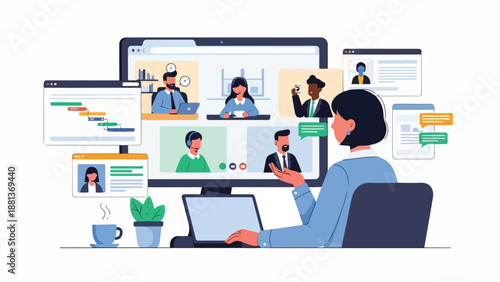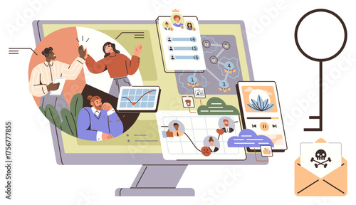 Vector security service police worker sitting control room front of monitors displaying video from surveillance cameras cartoon illustration. CCTV and computer system concept