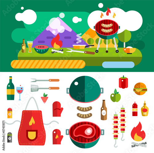 Vector set of amusement park concept posters, banners. Amusement park area with ferris wheel, shooting range attractions, food stalls, trolley and people having rest design elements in flat style.