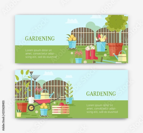 Vector set of amusement park concept horizontal banners. Amusement park, Entertainment, Sweets in the park design elements in flat style.