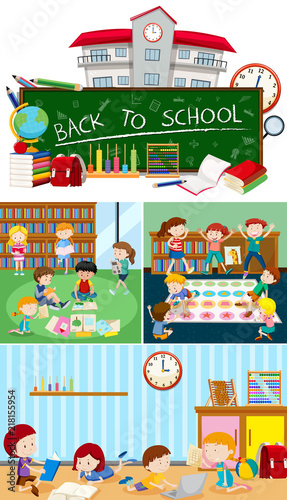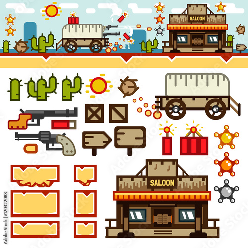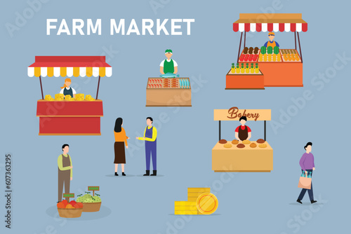 Vector set of amusement park design elements, icons in flat style. Kids with their parents, having rest, buying cotton candy, ice cream and hot dog. Street food truck, stall, kiosk. Shooting range.