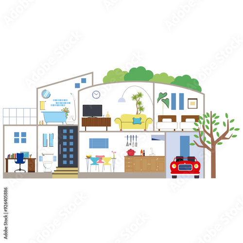 Vector set of bank interior concept design elements in flat style. Cashbox, waiting hall, bank employees workplaces, safe, self-service terminal, ATM, bank armored car.