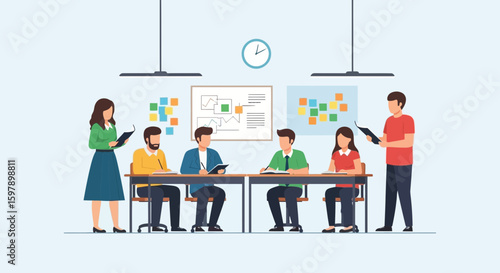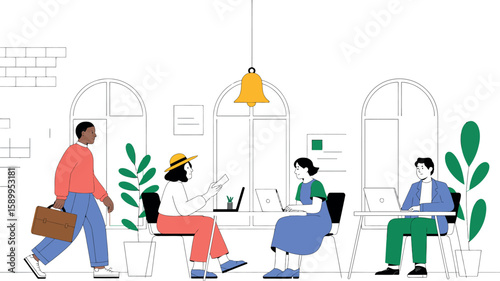 Vector set of banking concept design elements in flat style. Customers carrying out operations with self-service terminal. Bank teller serving clients. Waiting hall.